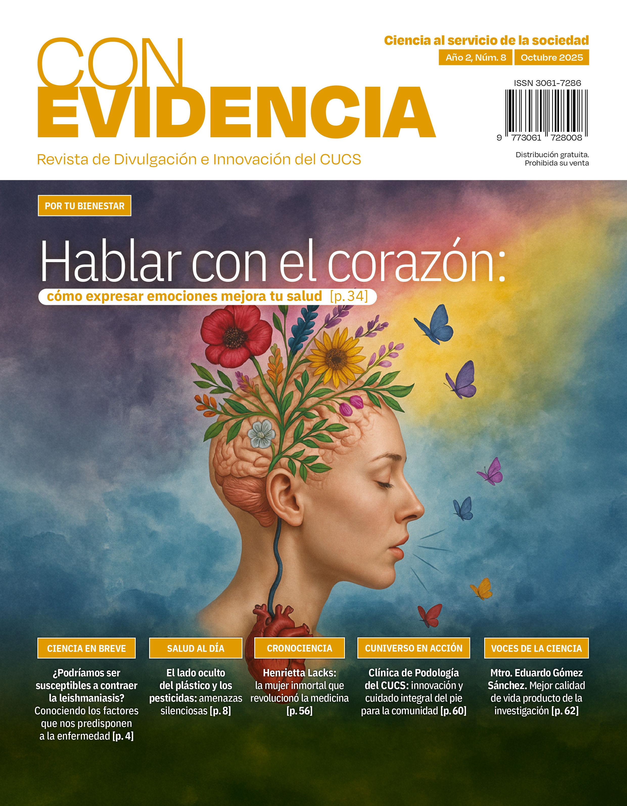 Con Evidencia, Año 2, No. 8, octubre-diciembre 2025, es una publicación trimestral, editada por la Universidad de Guadalajara, a través de la Coordinación de Investigación del Centro Universitario de Ciencias de la Salud (CUCS). Sierra Mojada #950, Edificio P-Q, CUCS, Col. Independencia, C.P. 44340. Guadalajara, Jalisco, México. Tel. +52 33 1058 5200, ext. 34200, https://www.cucs.udg.mx/, conevidencia@cucs.udg.mx. Editor responsable: Francisco Javier Turrubiates Hernández. Reserva de Derechos al Uso Exclusivo No. 04-2024-022912354900-102, ISSN: 3061-7286, otorgados por el Instituto Nacional del Derecho de Autor. Responsable de la última actualización de éste número: Coordinación de Investigación, CUCS. Sierra Mojada #950, Edificio P-Q, CUCS, Col. Independencia, C.P. 44340. Guadalajara, Jalisco, México, Francisco Javier Turrubiates Hernández. Fecha de la última modificación: 1 de octubre de 2025.